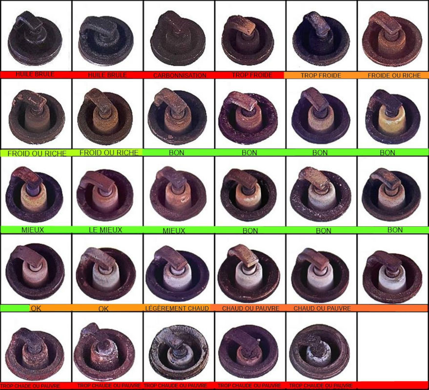 Both spark plugs should display the same color and fall within the acceptable range shown in the picture below. (Source: https://e85eml327.blogspot.com/2017/08/couleur-des-bougies-le85.html)
